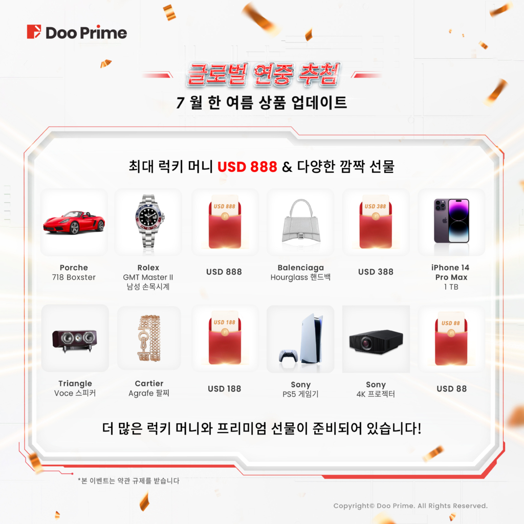 Doo Prime 글로벌 연중 대 추첨은 여전히 뜨거운 열기로 진행 중입니다. 해당 이벤트는 한 달 가까이 진행되었으며, 지금까지 2만 회가 넘는 추첨 기회를 선사하였고 수많은 럭키 머니와 다양한 상품들이 글로벌 고객님들로부터 호평을 받아왔습니다. 해당 이벤트에 대한 고객님들의 지지에 보답하기 위해 Doo Prime은 글로벌 고객님들과의 아름다운 7월을 함께 보내고자 7월의 상품 업데이트를 준비하였습니다.