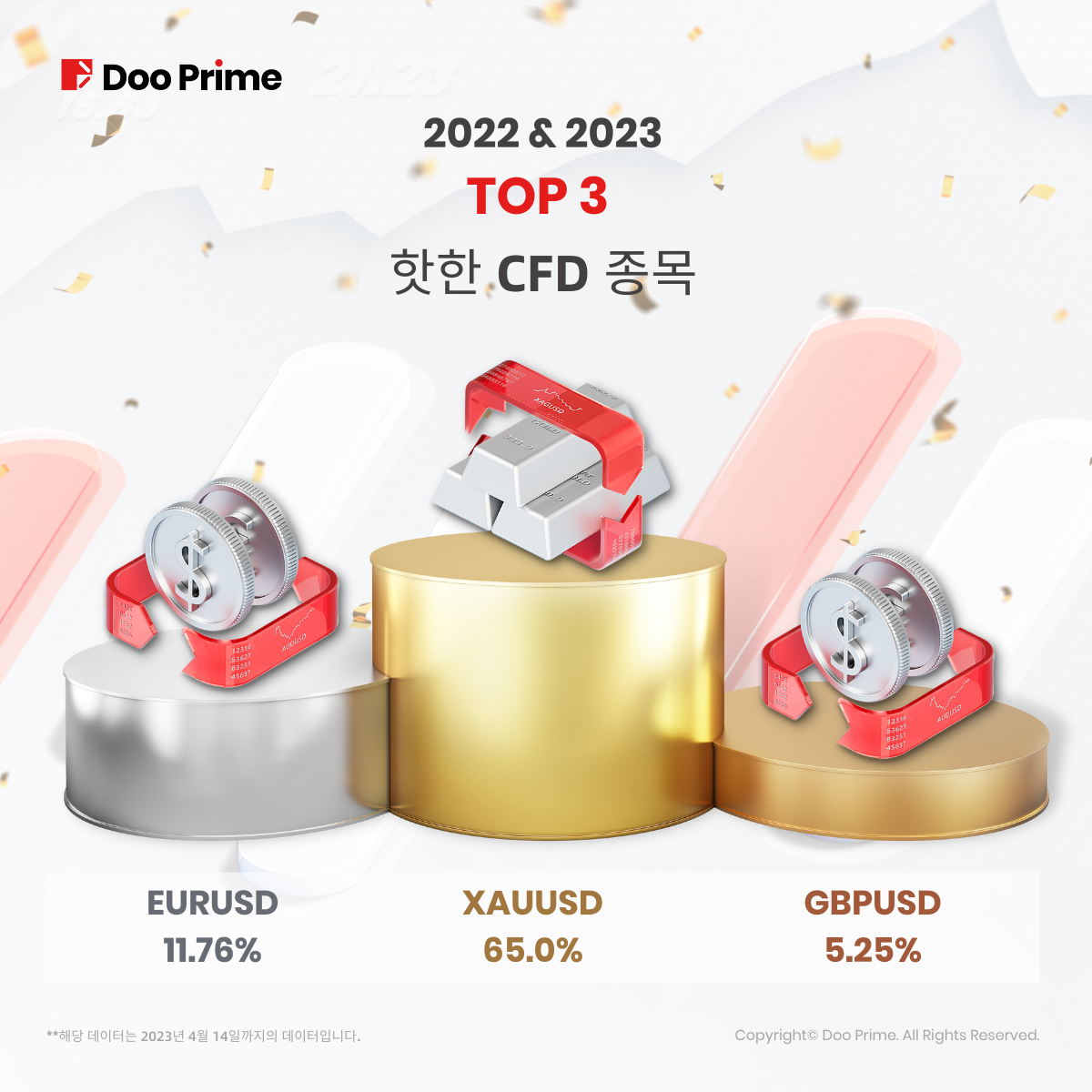 2022년과 2023년 1분기 무이자 거래에서 가장 인기 있는 제품은 XAUUSD, EURUSD 및 GBPUSD로 거래량은 각각 65%, 11.76%, 5.25%를 차지합니다. 고객은 이러한 인기 상품을 거래할 때, 무이자 거래를 통해 더 많은 비용을 절감했습니다.
