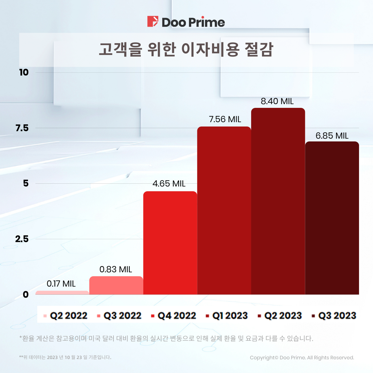 전반적으로 Doo Prime 무이자 및 금리 인하 혜택은 꾸준히 증가하고 있으며, 참여자 수가 증가하고 호평이 이어져 2022년 2분기부터 2023년 3분기까지 총 2,846만 달러 이상의 이자를 면제해 드렸습니다.