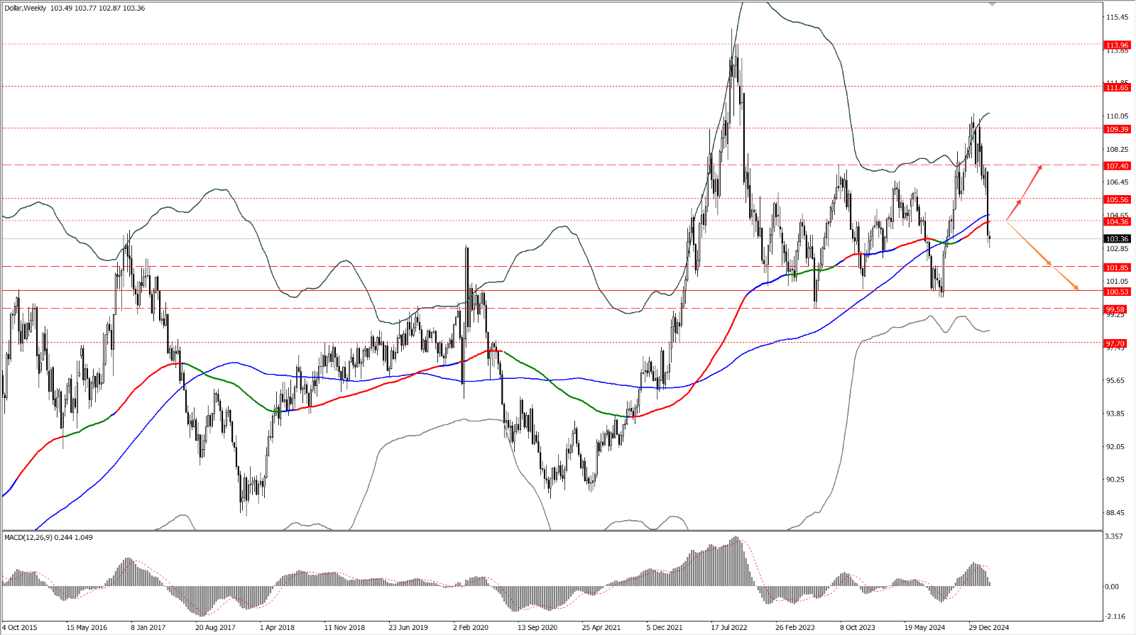 • 如果美指运行于 104.36 一线下方,则依次关注 101.85 和 100.53 两个位置的支撑力度;