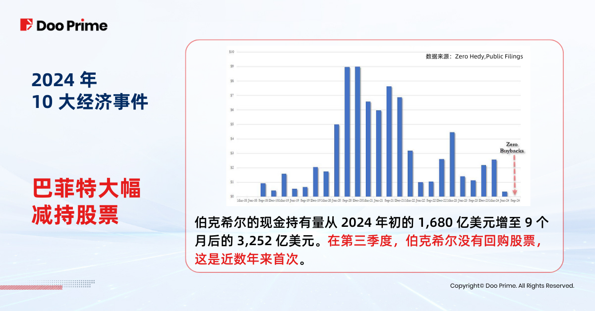 巴菲特的投资公司伯克希尔现金储备从 2024 年初的 1,680 亿美元增至 9 个月后的 3,252 亿美元,创下历史最高纪录。自年初以来,伯克希尔持有的苹果股份从 9.05 亿股降至 3 亿股,减少了约三分之二。