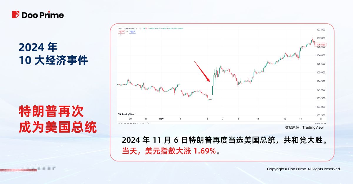 2024 年 11 月 6 日可以说是上演了 2024 年的重头戏,特朗普在当天击败哈里斯再次成为美国总统,并在胜选演讲中称接下来是 “ 美国的黄金时代 ”。当天,美国金融市场一片沸腾,美元指数大涨 1.69%,美三大股指盘中均创历史新高。