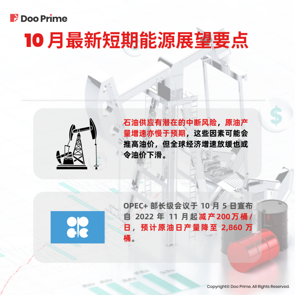 1. 在 2022 年 10 月 5 日举行的OPEC+ 部长级会议中,各成员国达成自 2022 年 11 月起减产200万桶/日的共识。据此,OPEC+ 预测,2022 年第四季度和 2023 年第一季度,欧佩克原油日产量将从 2022 年 9 月的平均 2,960 万桶下降至 2,860 万桶。