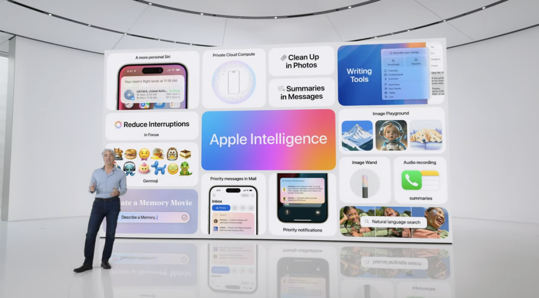 • 在 2024 年末发布(预计秋季)发布的预览版中,苹果智能将包含多项功能,如使用AI优先排序通知、快速回顾提醒和短信、网页摘要、语音备忘录、会议记录和电子邮件摘要,以及新的写作工具、图像生成和自定义 AI 表情符号 Genmoji。