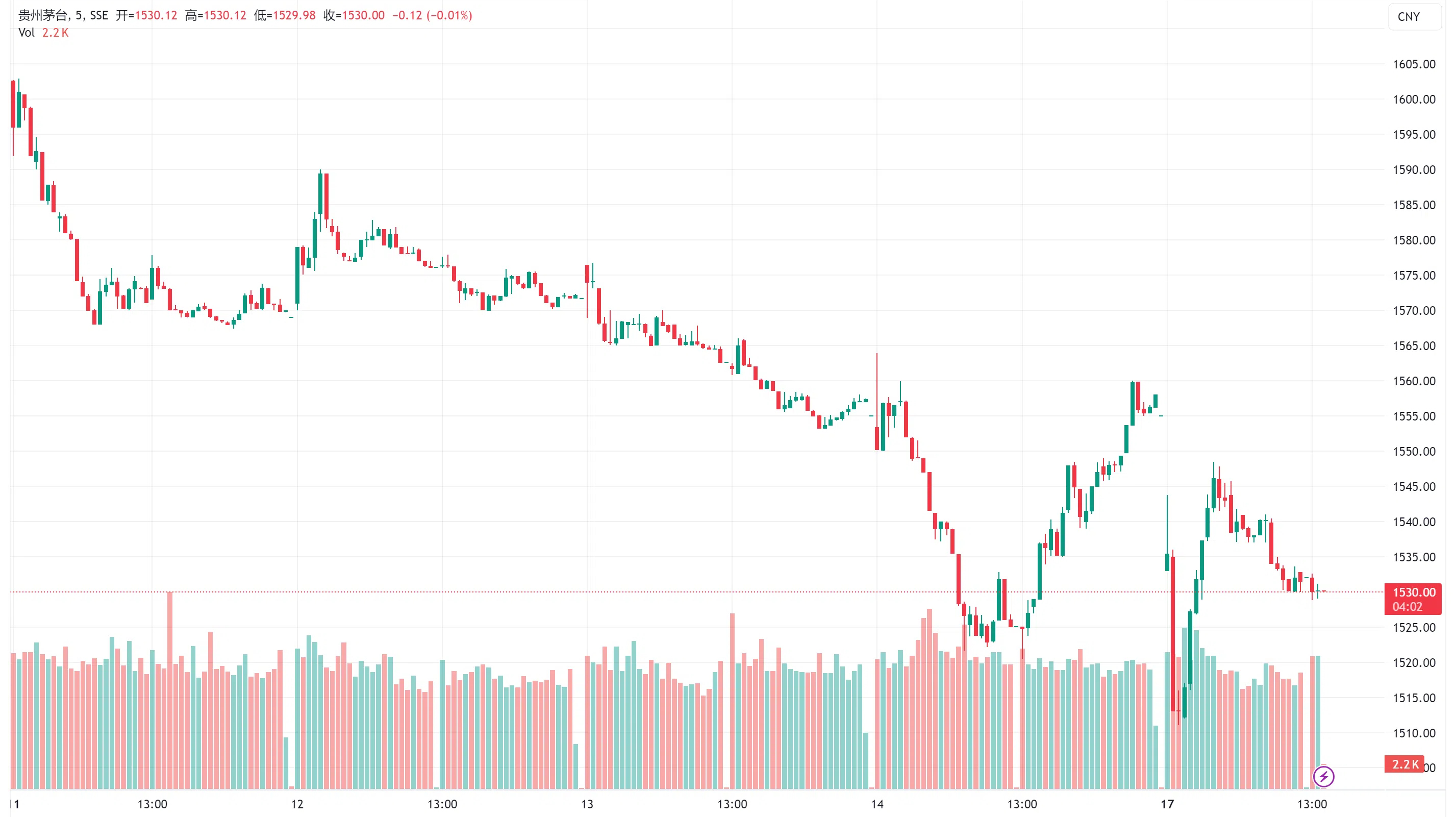 贵州茅台低开,盘中持续走弱,一度跌近 3%,最低价报 1511.01 元,创 2022 年 12 月以来新低,早盘收跌 1.48%。