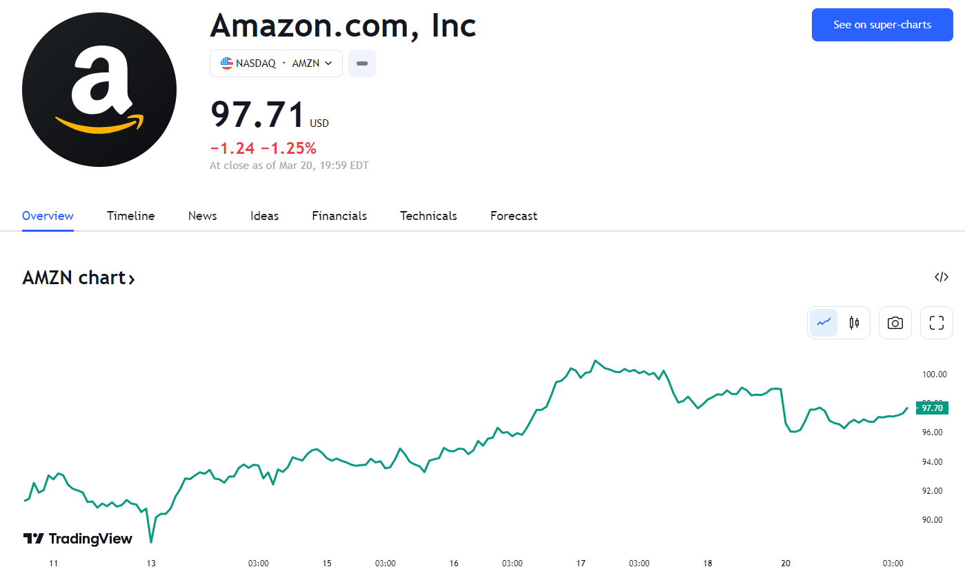 3 月 20 日,受到裁员消息影响,亚马逊股价一开盘走低,截至收盘,该股跌 1.25%,报 97.71 美元。