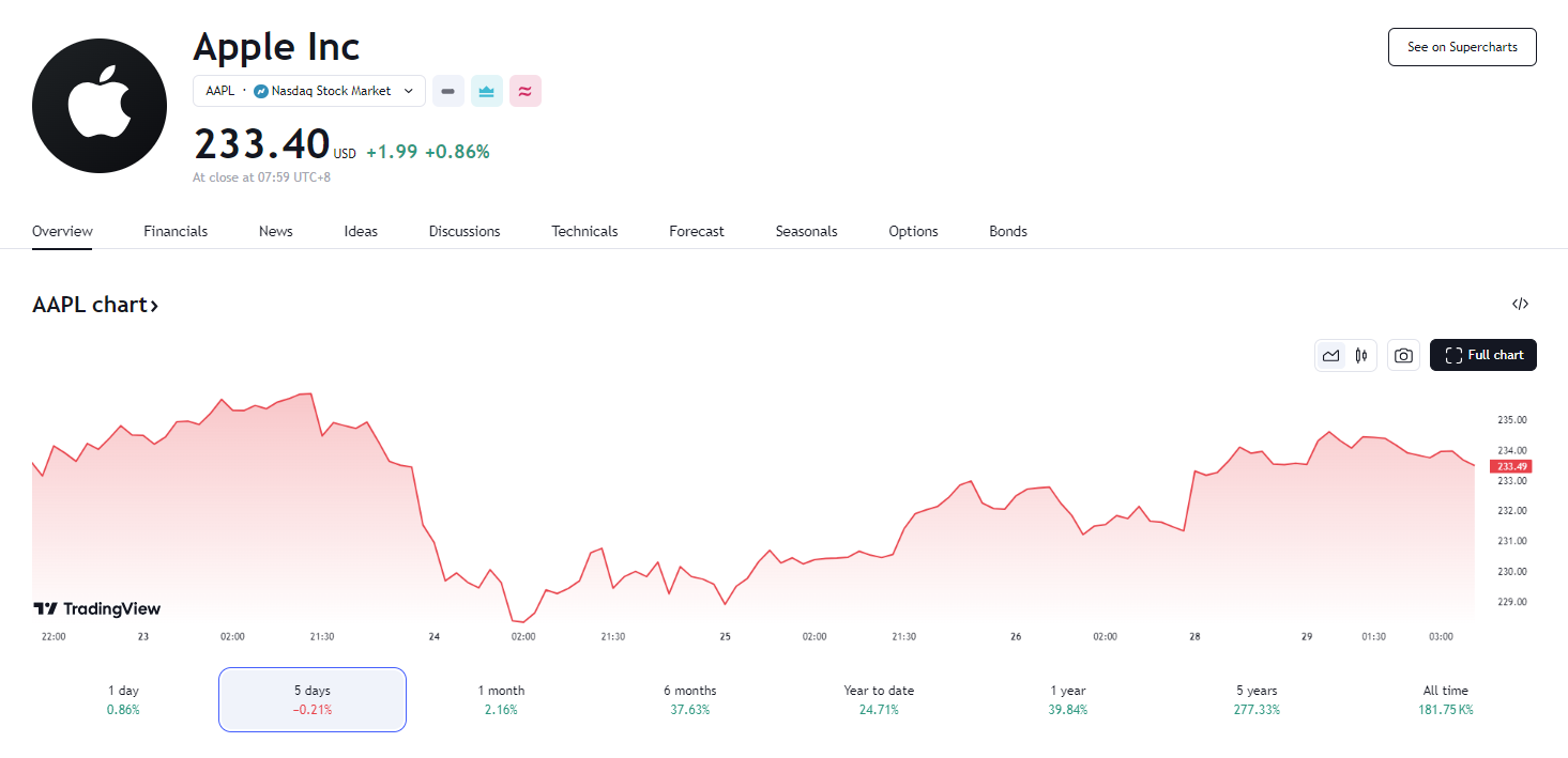消息发布后,苹果不断刷新日高并涨超 1%,接近收复上周二以来全部跌幅,最终收涨 0.86%。