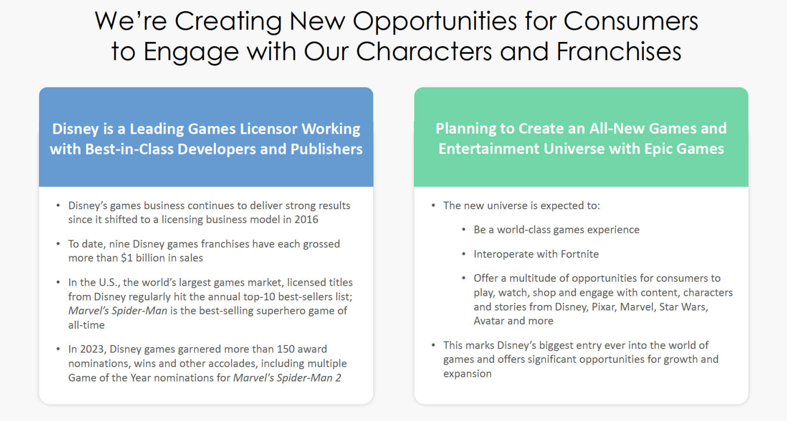 迪斯尼和 Epic 已合作多年,包括通过迪斯尼的加速器计划,该计划由公司高管指导小型企业。此外,Epic 为《堡垒之夜》玩家提供了基于《星球大战》、漫威和《夺宝奇兵》的角色,Epic 的虚幻引擎软件也已被用于开发迪斯尼游戏。