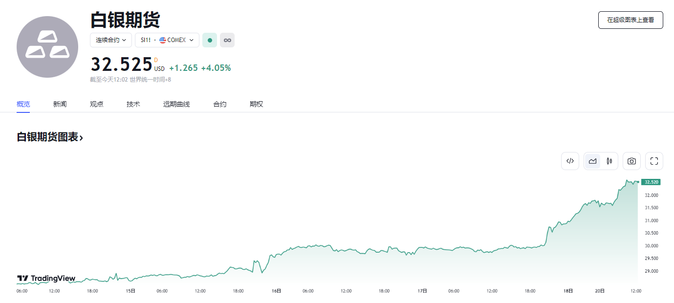 在金融和工业需求旺盛的背景下,白银的涨势比黄金更为迅猛,购买势头增强。白银今年已上涨约 30%,超越黄金,成为年内表现最佳的主要大宗商品之一。20 日亚洲时段开盘,现货白银价格日内盘中站上 32 美元/盎司关口,续创 11 年来新高。