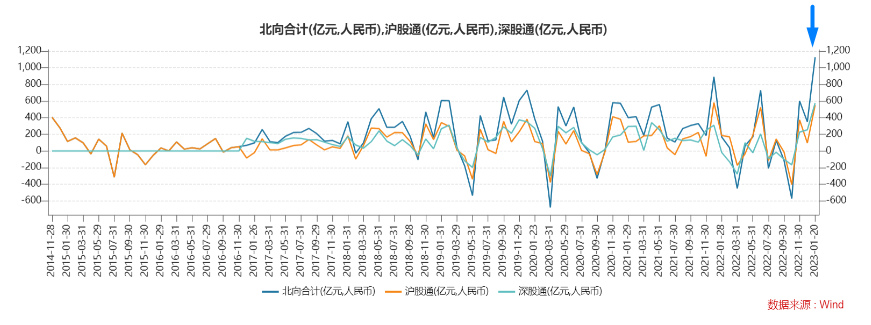 自 1 月 4 日开始截至春节前的最后一个交易日,北向资金启已连续 13 个交易日净买入,累计净买入额已达 1125 亿元,其净买入规模明显超过了 2022 年全年的 900 亿元,也创下了北向资金的单月净买额纪录。