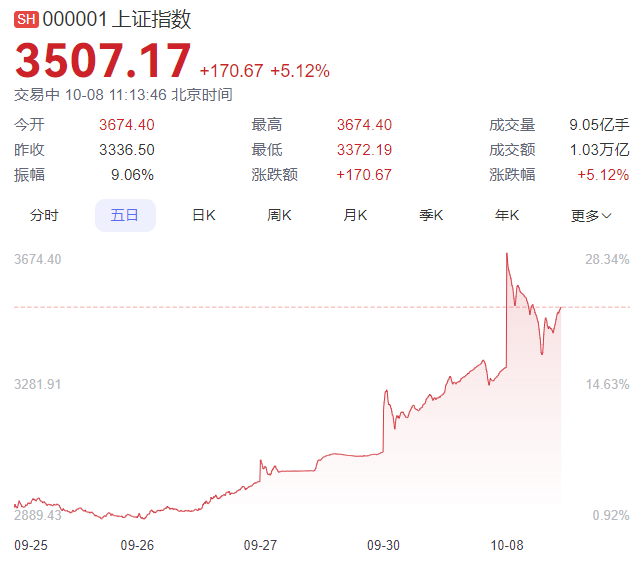 8 日,节后第一天开盘,中国 A 股大升,上证指数大涨 10.13%,升破 3600 点,深证成指涨 12.67%,创业板指涨 18.44%,全市超 5300 股上升,下跌个股仅 11 只,开盘 17 分钟全市成交额突破 5000 亿。