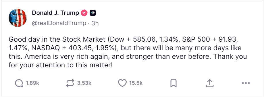 周一美股收盘后,特朗普在社交平台发帖称,股市表现良好,道指上涨 585.06 点(1.34%),标普 500 指数上涨 91.93 点(1.47%),纳斯达克上涨 403.45 点(1.95%),并表示 “美国再次变得非常富有,比以往任何时候都更强大”。