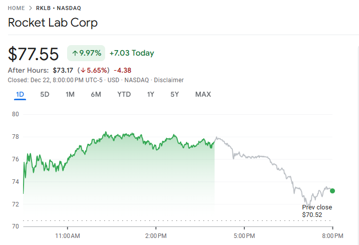 12 月 22 日至 23 日,Rocket Lab USA, Inc. 股价周三突破 74.26 美元,创下历史新高,标志着这家航空航天制造商及小型卫星发射服务提供商在资本市场上取得重要里程碑。过去一年中,公司股价累计上涨 183.55%,近六个月内涨幅达 134.75%,显著跑赢同业,反映其在快速成长的太空产业中持续扩大市场版图并成功执行战略规划。