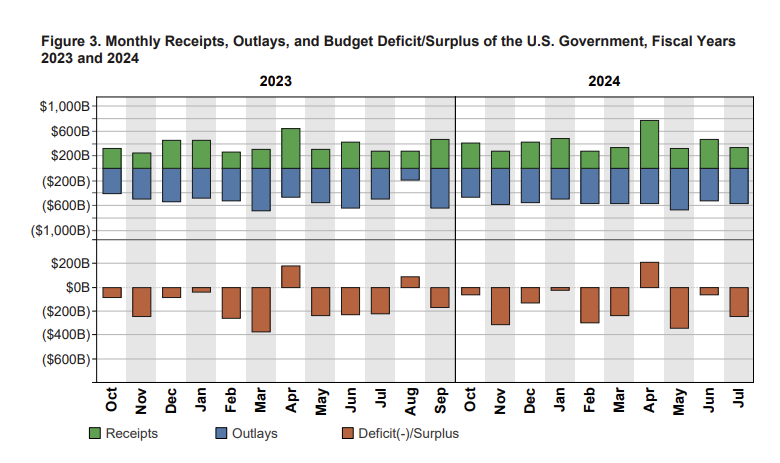 距离财政年度结束还有两个月,但美国 2024 财年预算赤字已达 1.517 万亿美元,与去年几乎持平,而且这是在没有紧急情况或战争的状态下。
