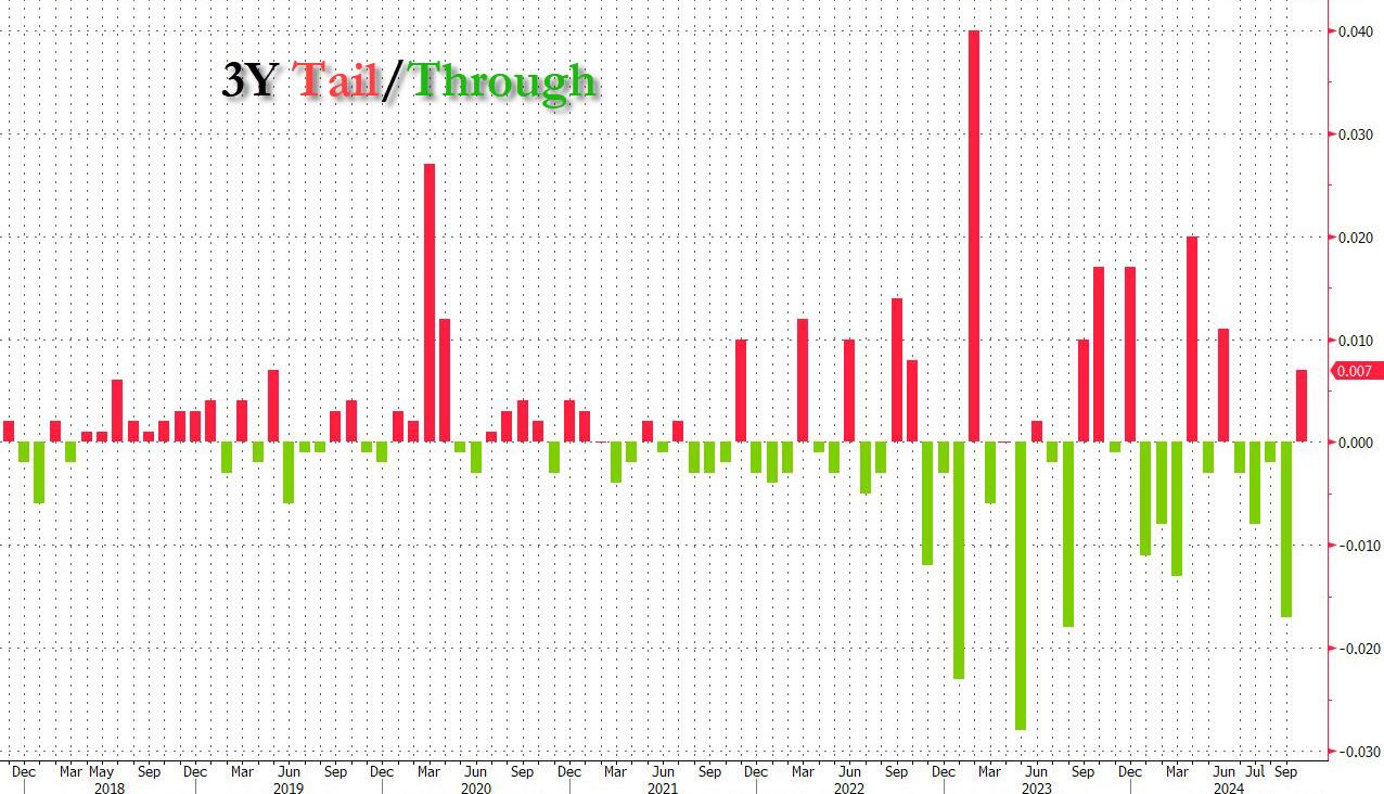 本次拍卖的得标利率为 3.878%,为今年 7 月以来最高。本次拍卖的预发行利率为3.871%,较最终得标利率低 0.7 个基点。这是自今年 6 月以来的首次、也是最大的尾部利差,体现需求疲软。