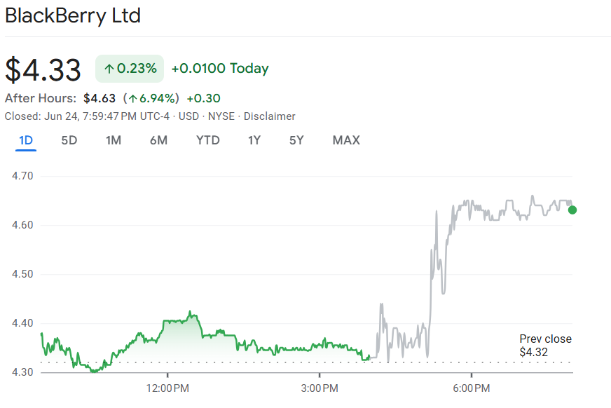 黑莓预计,该部门的营收将在 2.34 亿至 2.44 亿美元之间,高于此前预计的 2.3 亿至2.4 亿美元。黑莓股价盘后大涨近 7%。