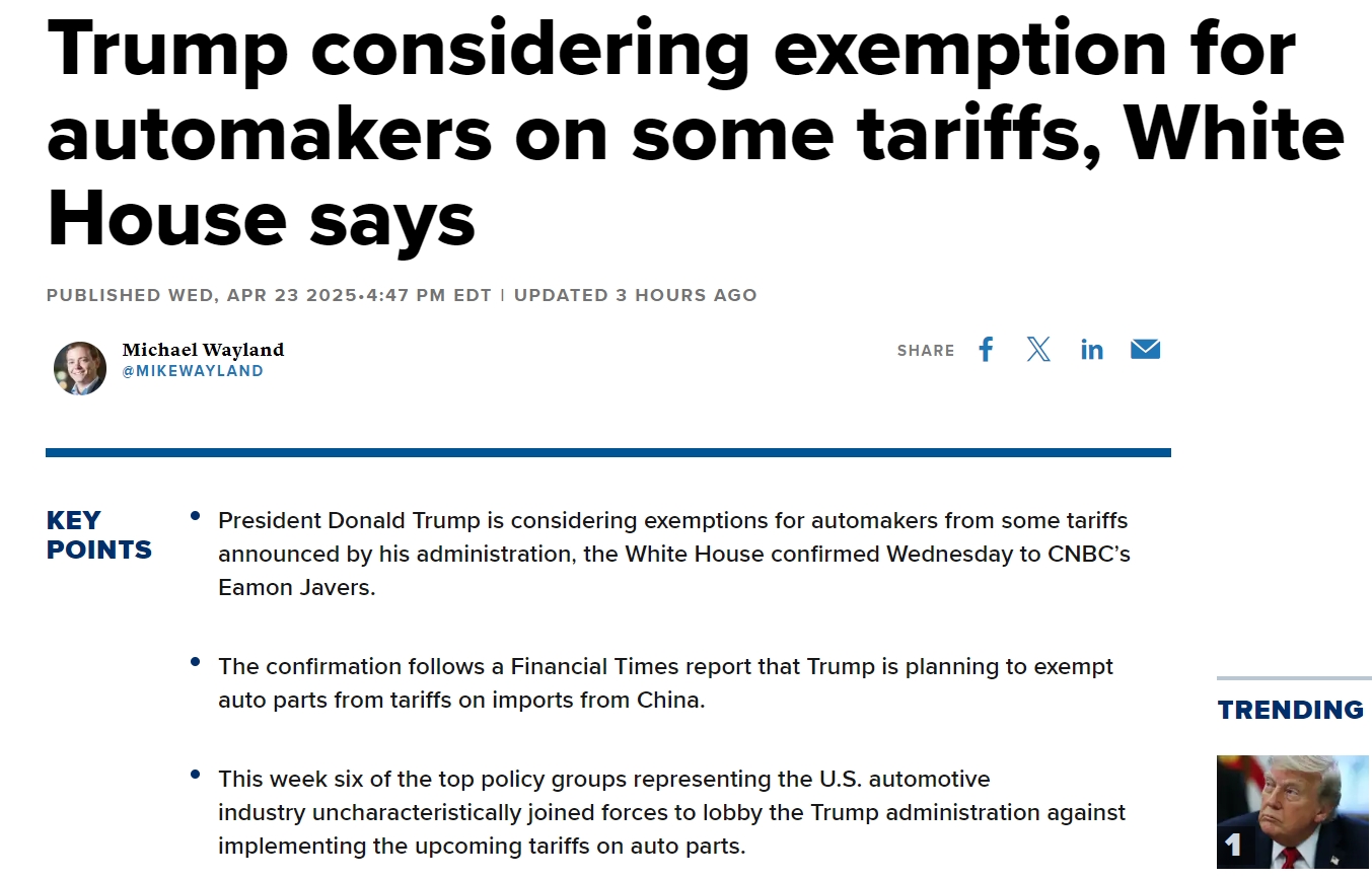 据 CNBC 报道,当地时间周三,白宫已向其证实,特朗普正考虑豁免汽车制造商部分关税。另有媒体称,特朗普拟豁免部分汽车零部件关税,包括对进口钢铁和铝产品的关税。