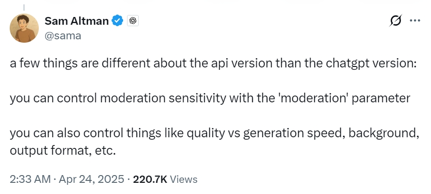 据 OpenAI CEO Sam Altman 表示,GPT-image-1 与 ChatGPT 版本有很大不同,用户可通过 moderation 参数控制内容审核敏感度,并可调节生成质量、速度、背景及输出格式。该模型支持近期爆火的吉卜力模式。据悉,目前 Adobe、Figma、HeyGen、Wix 等企业已将该模型集成至各自产品中。