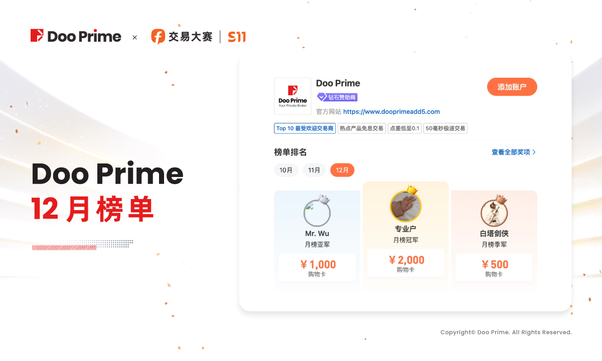 FOLLOWME S11 交易大赛从 2022 年 10 月开始至今年 1 月 1 日收官,在 12 月冲刺阶段中,Doo Prime 用户除了在总榜取得优异成绩,在 12 月月度榜单中更是成绩斐然,其中”专业户”取了 12 月月榜冠军,获得了平台的奖励;同时,一直表现极佳的”白塔剑侠”也获得了月榜季军。在本次比赛中,多位 Doo Prime 用户攘括多个奖项,展现了其综合的交易实力与多样实操策略,让我们领略了交易高手的技术与风采。