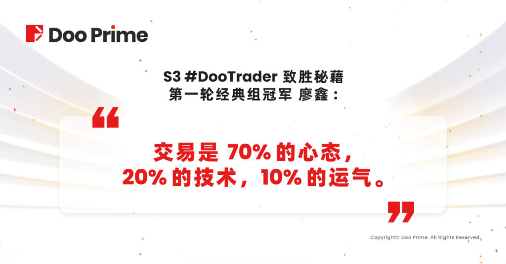 本届 S3 #DooTrader 慈善杯全球交易大赛现已经进入白热化阶段,第二轮赛事冲刺在即,各位选手摩拳擦掌争取赢得最终的丰厚奖金。目前,领先的选手调整策略和仓位,以保持排位优势。我们看到现阶段经典组 TOP 1 选手已经创造了 1,300% 的超高收益率;冲刺的选手也在努力奋斗中,希望在 TOP 排位中争得一席。为了帮助各位选手找到适合自己的交易方向,并一同为奋战的选手加油助威。今天我们邀请到第一轮比赛的冠军选手廖先生与选手们一起分享他的致胜攻略。