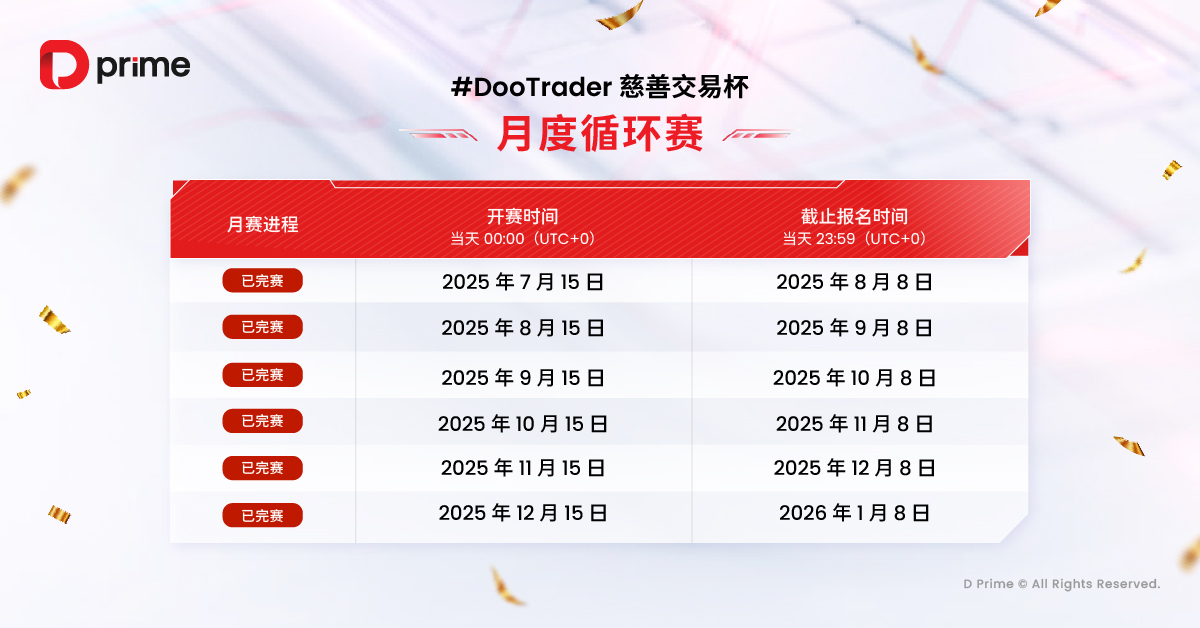 D Prime #DooTrader 慈善交易杯第六轮月赛已于 1 月 14 日 23:59(UTC+0)顺利落幕,赛果榜单火热揭晓!历经半年的鏖战,六轮月赛圆满收官,赛事正式迈入岛屿争霸赛决赛阶段!