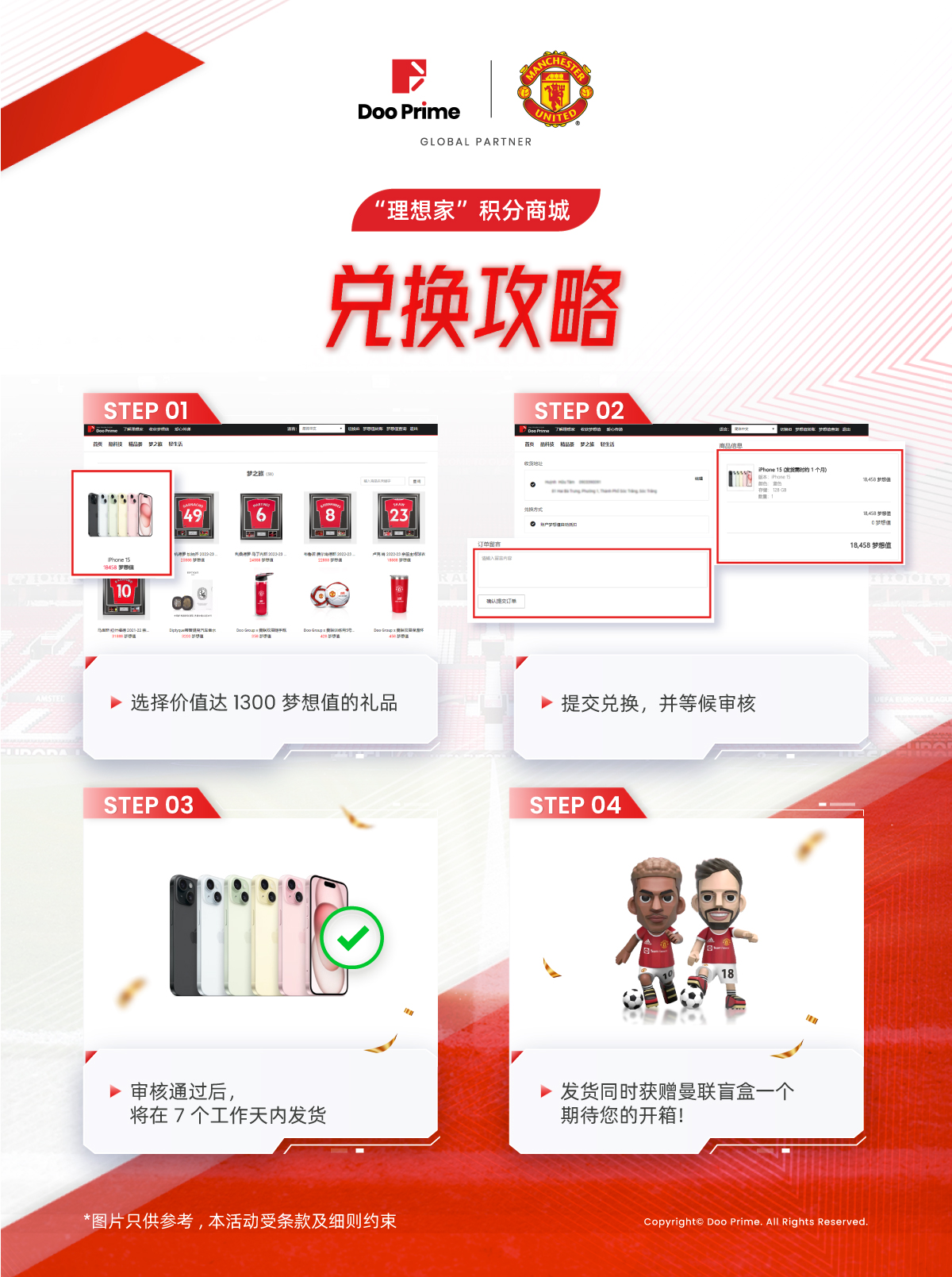 您只需在 2024 年 6  月 20 日至 6 月 30 日(UTC+8)活动期间,登录 Doo Prime 积分商城,单次兑换实体礼品满 1,300 积分,即可获赠曼联盲盒公仔一个。活动不设兑换上限,每一份符合条件的订单都可参与。每次兑换都会给您带来不一样的惊喜!感谢您一同见证了 Doo Prime 与曼联彼此的成长与辉煌。