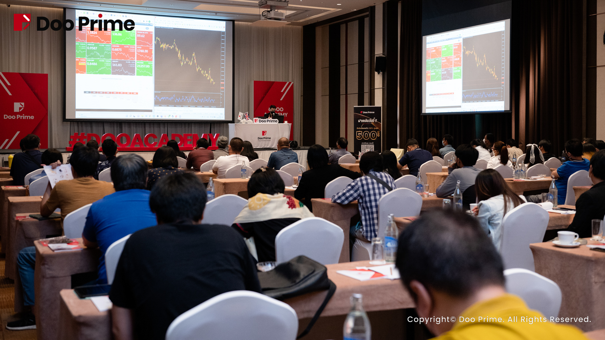 Doo Academy ได้จัดงานสัมมนาครั้งแรกในประเทศไทยเมื่อวันเสาร์ที่ผ่านมา. “เทรดทองแบบฟลูไทม์” ได้ประสบความสำเร็จและมีผู้เข้าร่วมงานสัมมนาครั้งนี้อย่างล้นหลาม ที่โรงแรมอีสตินแกรนด์ สาทร เมื่อวันที่20 สิงหาคม 2565 โดยได้มีการจัดของว่าง ของขวัญตอนรับลูกค้า เป็นอย่างดี จาก Doo Academy รวมถึงบูทถ่ายภาพและเกมแจกของรางวัล ที่จัดเตรียมให้ผู้เข้าร่วมงานสัมมนาทุกท่านได้ร่วมสนุก