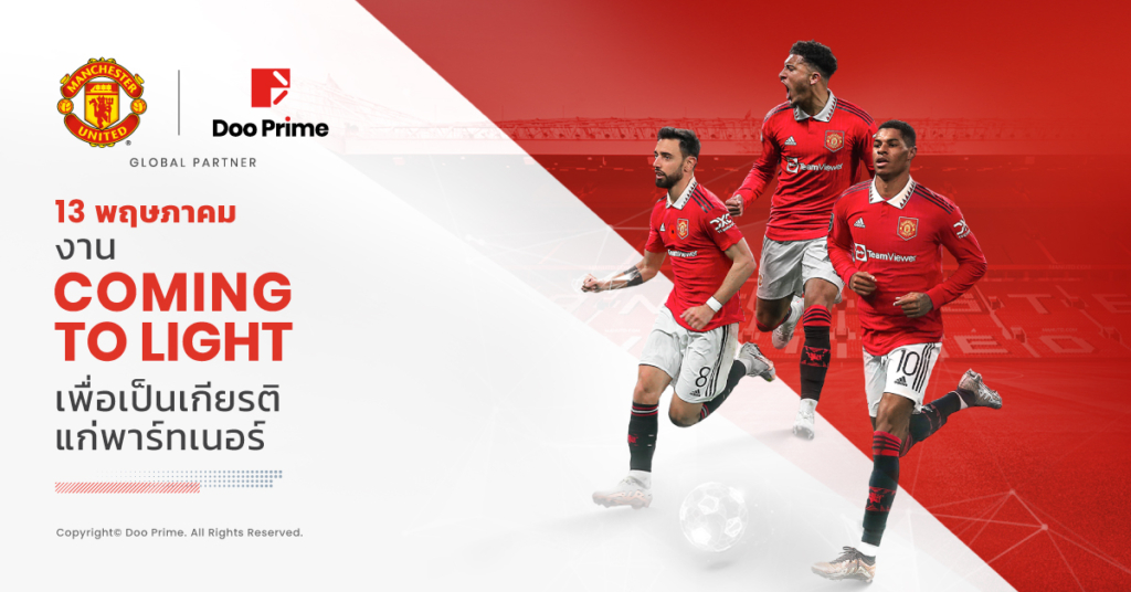 มหาอำนาจด้านฟินเทคชั้นนำอย่าง Doo Group และยักษ์ใหญ่ในวงการฟุตบอลที่มีชื่อเสียงที่สุดในโลกอย่างแมนเชสเตอร์ยูไนเต็ด จะมารวมตัวกันเพื่อให้เราสามารถเชื่อมต่อกับผู้ชมทั่วโลกได้มากขึ้น และเพื่อเป็นสัญลักษณ์แห่งความสำเร็จครั้งยิ่งใหญ่ของ Doo Group ในการเป็น “พาร์ทเนอร์ในฐานะแพลตฟอร์มเทรดดิ้งออนไลน์อย่างเป็นทางการ” ของสโมสรฟุตบอลแมนเชสเตอร์ยูไนเต็ด โดยจะมีการเปิดตัวกิจกรรมต่างๆ มากมายที่สนามกีฬา Old Trafford เมืองแมนเชสเตอร์ ประเทศอังกฤษ