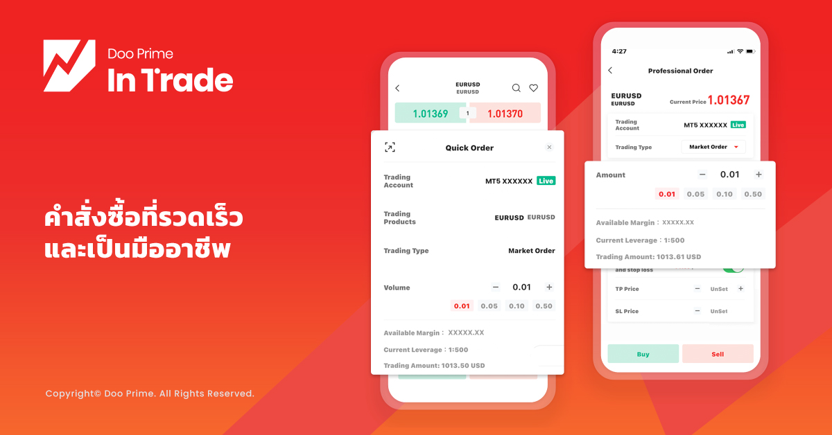 ความรวดเร็วในการซื้อขายเป็นปัจจัยที่สำคัญมากสำหรับนักลงทุน แอพ Doo Prime InTrade นั้นเสริมการสั่งซื้อแบบด่วน และตัวเลือกคำสั่งซื้อแบบมืออาชีพสำหรับนักลงทุน รวมถึงช่วยให้การซื้อขายมีความมืออาชีพมากขึ้นโดยตัวเลือกจะช่วยให้นักลงทุนสามารถซื้อ หรือขาย รวมถึงเลือกประมาณการซื้อขาย และสามารถดูภาพรวมมาร์จิ้น เลเวอเรจการซื้อขาย บวกกับจำนวนการซื้อขายในปัจจุบัน และนักลงทุนยังสามารถตั้งค่ากำไร เพื่อจะช่วยให้หยุดซื้อขายก่อนขาดทุนได้อีกด้วย