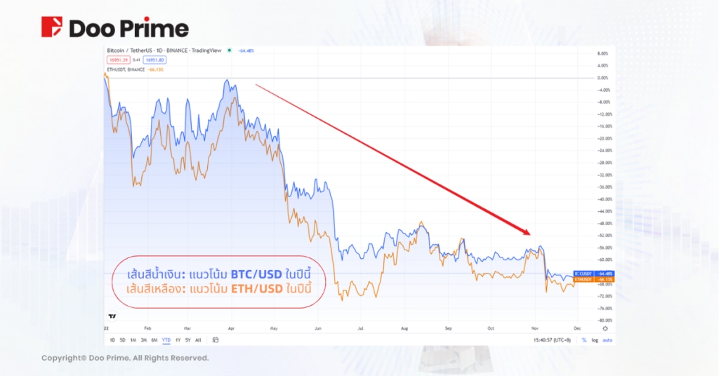 ในเดือนพฤศจิกายนปีนี้ FTX บริษัทระดับโลกที่ให้บริการซื้อขายคริปโตฯ อันดับ 3 ได้ยื่นล้มละลาย ซึ่งเหตุการณ์ได้คล้ายกับการที่ Lehman ยักษ์ใหญ่การเงินของสหรัฐฯ เคยยื่นล้มละลายในช่วงวิกฤตแฮมเบอร์เกอร์ สิ่งนี้ทำให้ราคา Bitcoin, Ethereum และ เหรียญคริปโตอื่นๆ ร่วงลงทันที