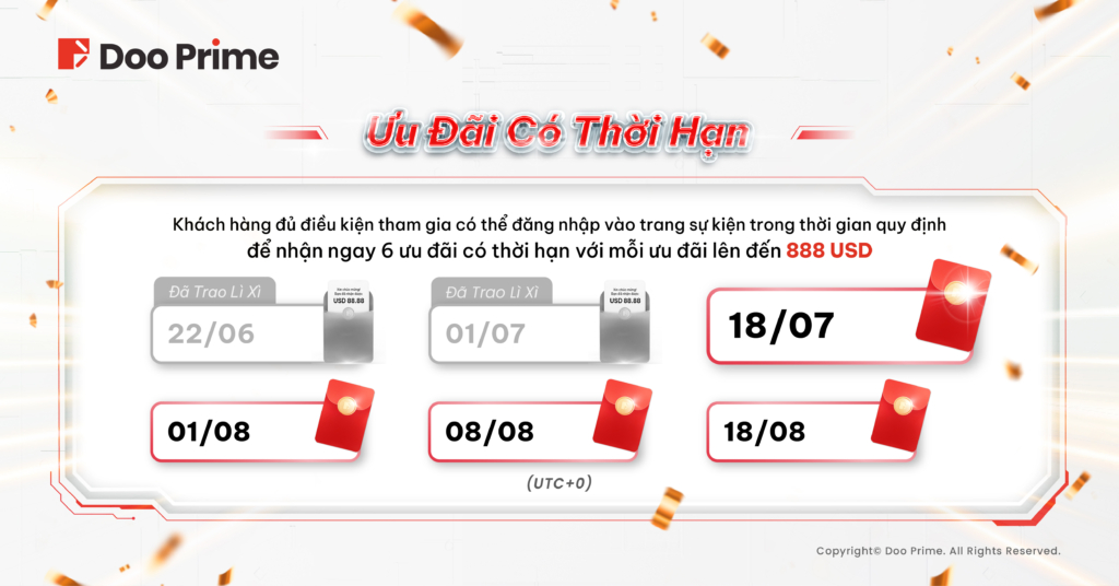 Bên cạnh hệ thống giải thưởng siêu “khủng” trong chương trình Giveaway, Doo Prime còn mang đến Ưu Đãi Có Thời Hạn độc quyền cho quý khách hàng thân yêu! Tất cả những gì bạn cần làm là nạp 100 USD và hoàn thiện 1 lô giao dịch với tài khoản Doo Prime trong thời gian diễn ra sự kiện. Lúc này, bạn sẽ nhận liền tay một Ưu Đãi Có Thời Hạn với giá trị lên đến 888 USD! Ngoài ra, chúng tôi còn mang đến 4 Đợt Ưu Đãi Có Thời Hạn tiếp theo cho người chơi. Đừng bỏ lỡ!