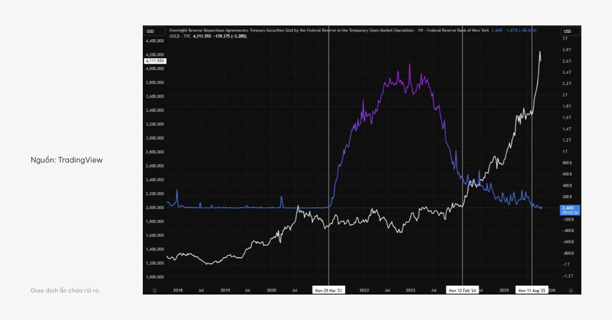 Khi số dư của những hợp đồng Repo nghịch đảo – nơi các ngân hàng và quỹ gửi tiền dư qua đêm – bắt đầu sụt giảm về mức gần bằng 0; thì vàng bắt đầu tăng nhiệt.