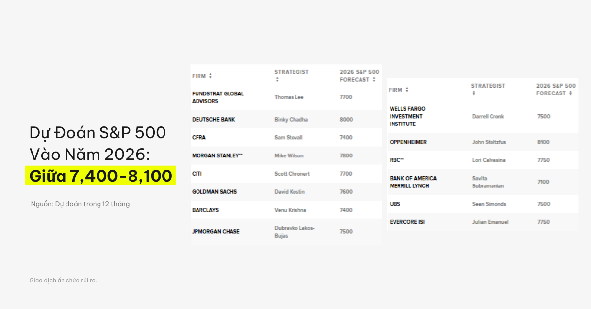 Theo Khảo sát của Chiến lược Gia Thị Trường năm 2026 từ CNBC, hầu hết các ngân hàng và công ty quản lý tài sản lớn đều kỳ vọng S&P 500 sẽ giao dịch ở mức cao hơn đáng kể trong năm tới, khi mà các dự báo tập trung trong vùng 7,400 – 8,100 điểm.