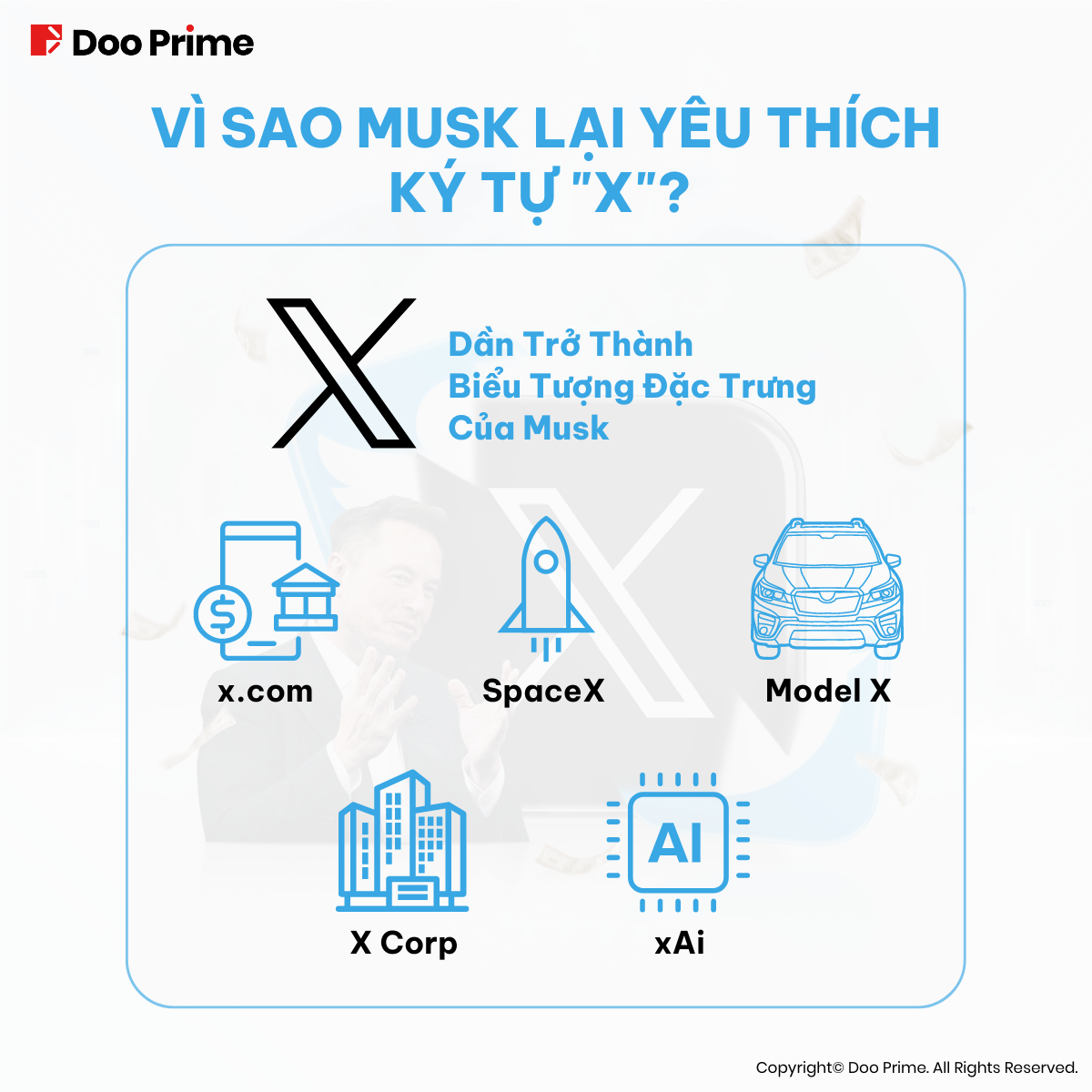 Ngoài ra, công ty thám hiểm không gian của Musk – được thành lập vào năm 2002, cũng chứa ký tự X đặc trưng, với tên gọi “SpaceX”. Vào năm 2015, công ty năng lượng và xe điện Tesla cũng giới thiệu một trong những mẫu xe hàng đầu mang tên “Model X”. Bên cạnh đó, vào năm 2023, Musk đã đăng ký “X Corp” với vai trò là Tổng Công ty của Twitter. Đặc biệt, không nằm ngoài xu thế AI, Musk thành lập công ty trí tuệ nhân tạo của riêng mình – “xAI”.